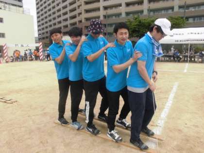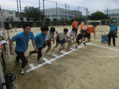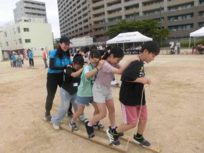 徒競走の次はムカデ競争です。まずは、こども育成会と先生たちで見本の競争をしましたが、先生チームが勝ちました。苦労したチームもありましたが、どのチームもみんなで力を合わせて最後までチームワークよくゴールすることができました。