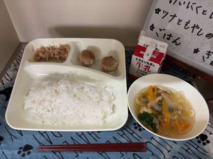 今日の給食は、「焼きシューマイ」「鶏肉とはるさめのスープ」「ツナともやしのいためもの」「ごはん」「牛乳」でした。