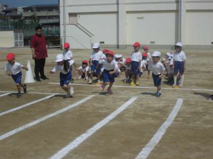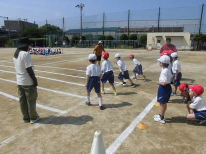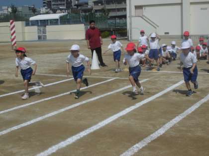 1年生が、運動会の徒競走の練習をしています。しっかりスタートの合図を聞いて、みんな一生懸命に走っていました。