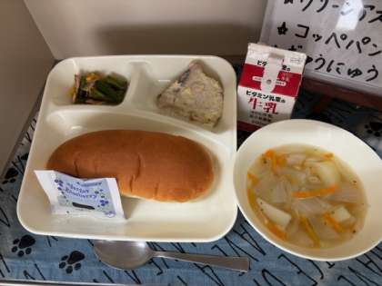 今日の給食は、「かつおのガーリック焼き」「押麦のスープ」「グリーンアスパラガスのソテー」「コッペパン」「ブルーベリージャム」「牛乳」でした。