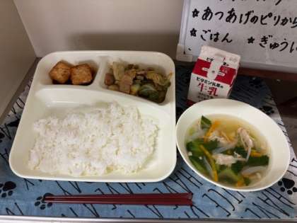 今日の給食は、「ホイコウロー」「中華スープ」「あつあげのピリ辛じょうゆかけ」「ごはん」「牛乳」でした。