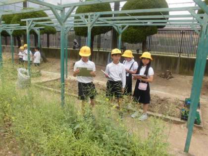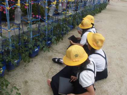 2年生が、タブレットで写真を撮りながらサツマイモやミニトマトの観察をしました。みんなで協力しながらたくさんの写真を撮ることができました