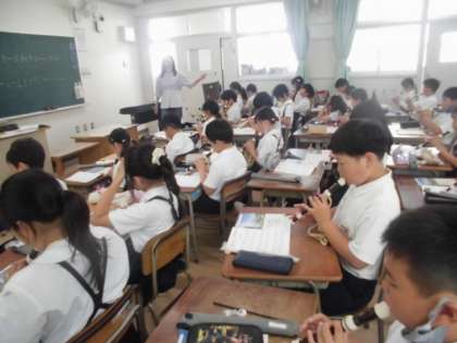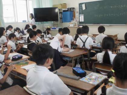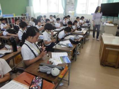 4年生が音楽で「エーデルワイス」をリコーダーで吹いています。指使いに注意しながらやさしい音色で吹けるようにがんばっていました。