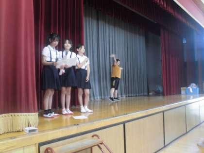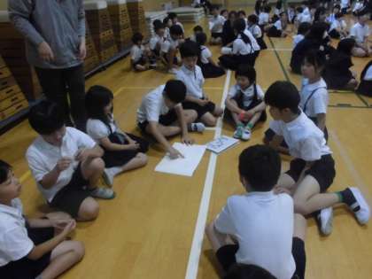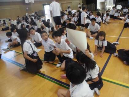 児童集会で先生当てクイズをしました。たてわり班ごとにみんなで考えてホワイトボードに書いて答えました。班で協力しながら活動することができました。
