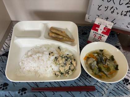 5日(木)の給食は、「いわしてんぷら」「五目汁」「とりなっ葉いため」「ごはん」「牛乳」でした。