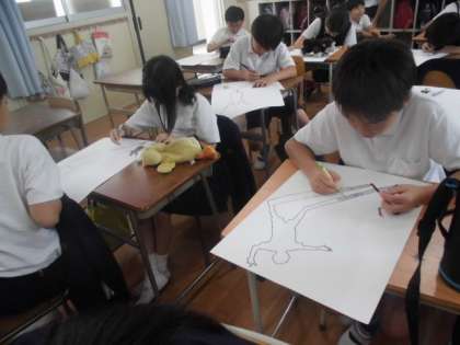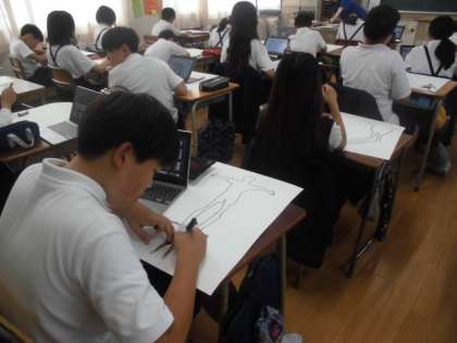 6年生が、図工で「フシギなカゲ」の学習をしました。自分の写真を撮って印刷して画用紙にはり、影を描きました。そしてその影をゼンタングルという独特な描き方で模様をつけました。フシギなカゲのある素晴らしい作品ができてきました。