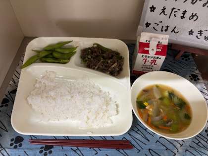 給食では、牛肉とピーマン、たけのこをいため、砂糖やしょうゆ、オイスターソースなどで味つけしています。