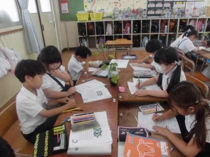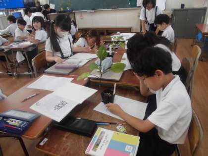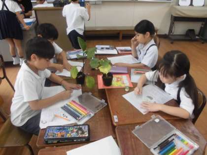 2年生が、生活科でナスとキュウリの苗の観察をしました。苗の高さを図ったり、葉を手で触って感触を確かめたりして、いろいろな方法で観察していました。