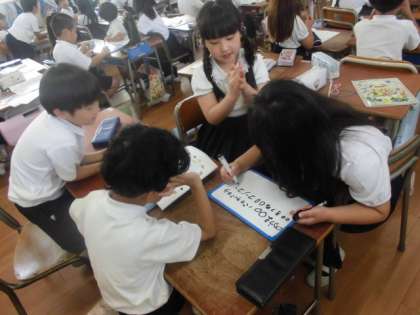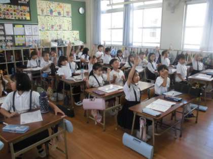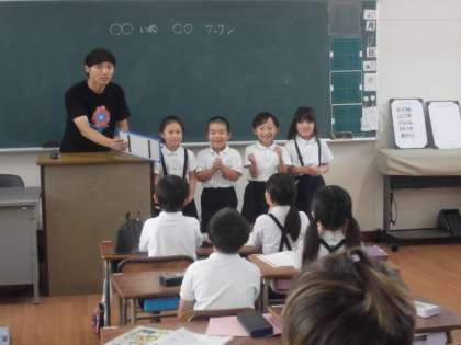 2年生が、音楽で好きな動物の鳴き声でラップをしました。班ごとに動物と鳴き声を考えてみんなに当ててもらいました。みんなでとても盛り上がりました。