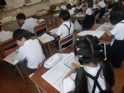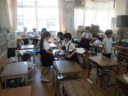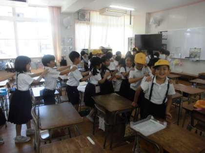 2年生は、帰りの会であいさつ週間の振り返りカードを書きました。みんなで自分のあいさつや服装などを振り返りながら書きました。その後はじゃんけん列車をしました。帰る前に楽しくみんなで活動しました。