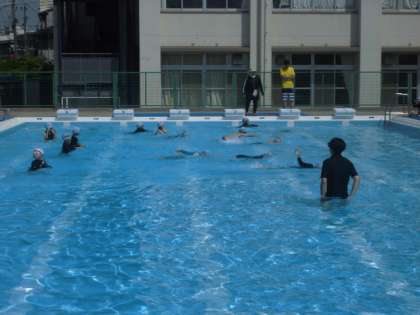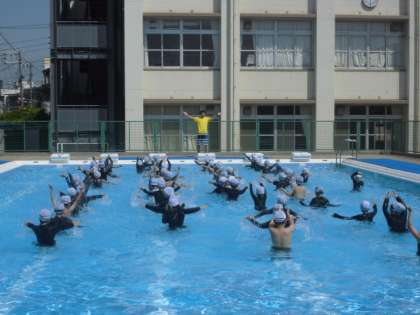 2年生がプール開きをしました。音楽に合わせて水遊びをした後に、プールの中を歩いたり、泳げる人は泳いだりしました。みんな楽しくプールに入ることができました。