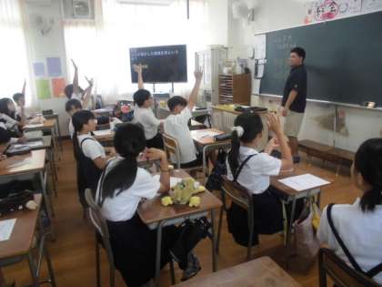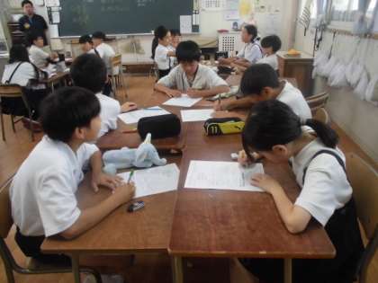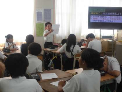 6年生が、大正東中学校の先生の社会と道徳の授業を受けました。社会では過疎の地域の町おこしについて考えました。最後に班ごとに発表をしました。