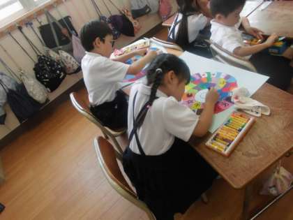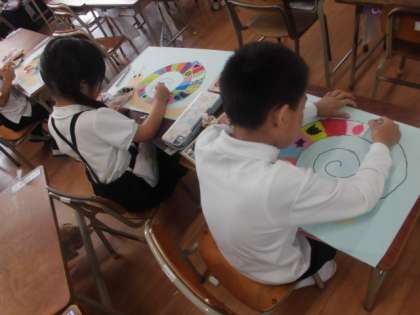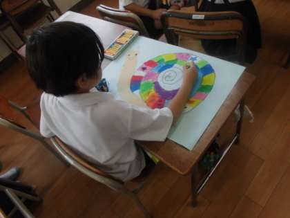 1年生が、クレパスでカタツムリの色塗りをしています。一人一人が考えた模様に一生懸命塗り込んでいました。