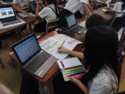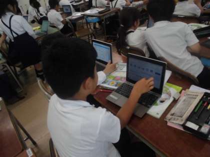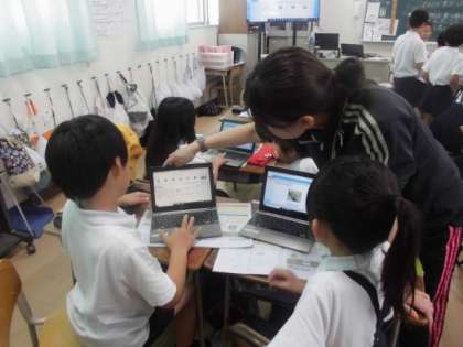 3年生が育てているマリーゴールドとホウセンカの観察をしています。学習園へ行ってタブレットで撮って来た写真を発表ノートにまとめて先生に提出しました。みんな課題の提出にも慣れてきました。