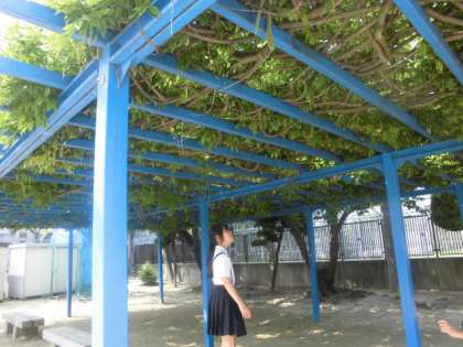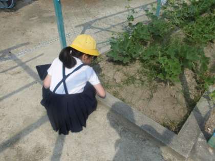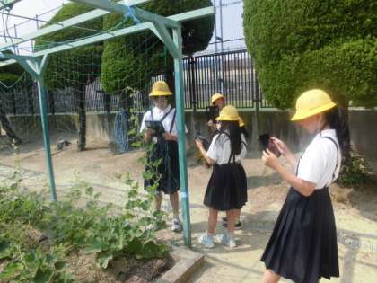 4年生が理科で育てているヒョウタンの観察をしました。タブレットで写真を撮ってまとめていきます。4月から観察を続けている植物も観察しました。フジは花が散った後の種を観察していました。
