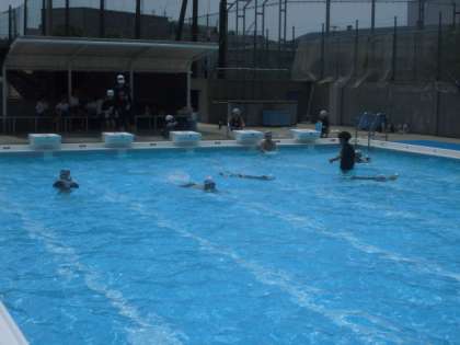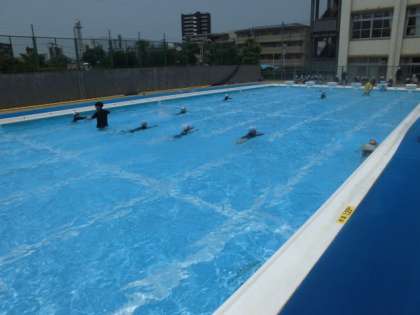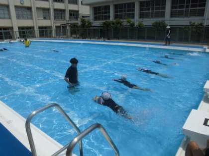 2年生は、ばた足が何メートル泳げるかをはかりました。クロールなどの他の泳ぎ方ができる子はその泳ぎ方で泳ぎました。なかなか体が浮かず、前に進まない子もいましたが、みんな1メートルでも多く前に進もうとがんばっていました。