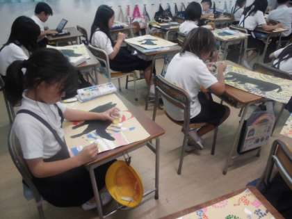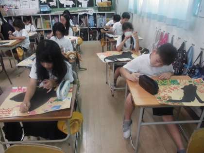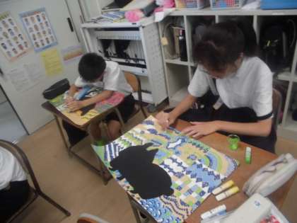 4年生が図工で、アボリジニーアートに取り組んでいます。動物の後ろの背景などを綿棒を使って描いています。様々な工夫が見られて面白い作品がたくさんできています。