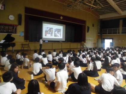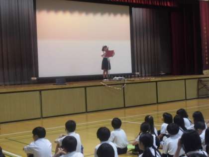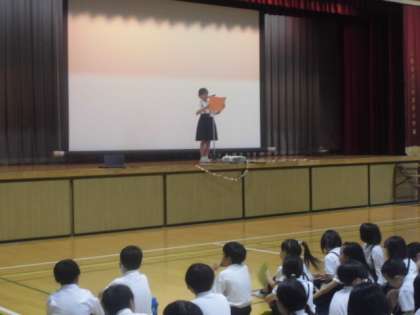 始業式では大阪市歌を歌った後、4年生と5年生の代表から1学期の振り返りの発表がありました。2人ともしっかりと発表することができました。続いて1学期のキャリアパスポートを紹介しながら、1学期を振り返りました。みんなで一人一人のがんばりを振り返ることができました。