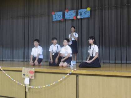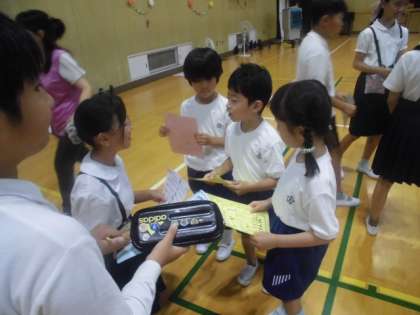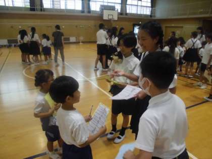 6年生が学級活動で、1年生といっしょにふれあうために集会を企画しました。今日は集会の当日でした。自己紹介をするゲームをして、しっかりと触れ合う時間を持つことができました。