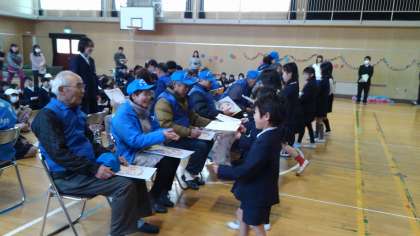 縦割り班で一生懸命作った手づくりの感謝状をお渡ししました。