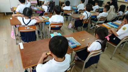 1時間目は1年生で算数の授業研究会をしました。「のこりは いくつ」という学習を、ブロックを使って考えました。