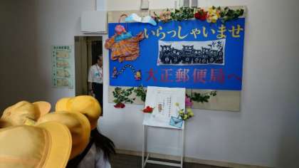 今日は、2年生が、町たんけんに出かけました。学校から、大正駅付近の様子を見た後、大正郵便局に来ました。