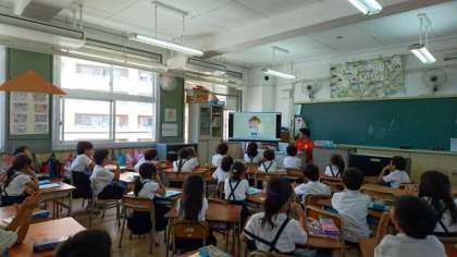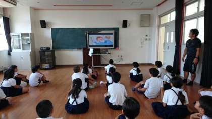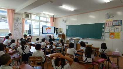 今日から、音だけでなく、映像も使って、英語を始めました。5時間目の開始前、5分間、各学級で一斉に実施しています。