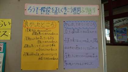 今日は、まず、先週に取り組んだ「ろうか かいだんを 正しく歩こう週間」の振り返りをしました。