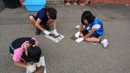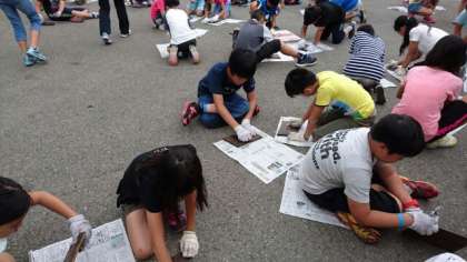 今から、焼き板作りをします。まず、昨日、川で洗った板を新聞紙で磨きます。