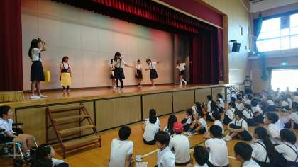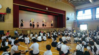 今日の全校児童集会は「何をしている?」でした。3人のジェスチャーがよくそろっていて、とても楽しかったです。