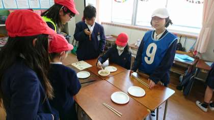 制限時間内に、割り箸で豆をつかんで、お皿に入れます。