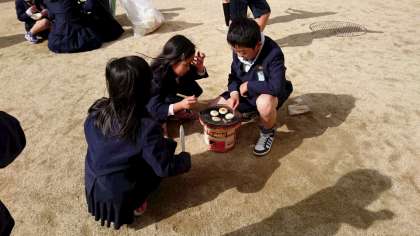 途中で雪も少し降ってきましたが、こんがり焼けたおいしいおもちをみんなで食べました。