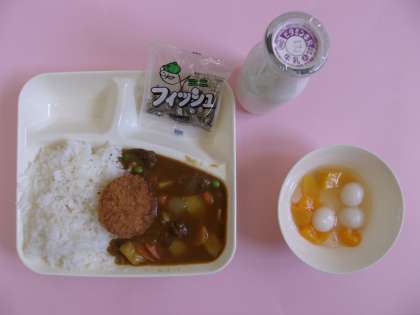 今日の献立は、「カツカレーライス、フルーツ白玉、ミニフィッシュ」でした。
