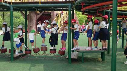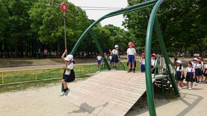 3,4年生が久宝寺緑地に来ました。早速遊具で元気に遊んでいます。