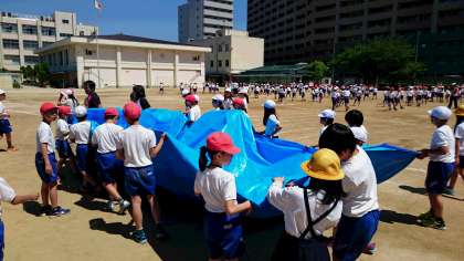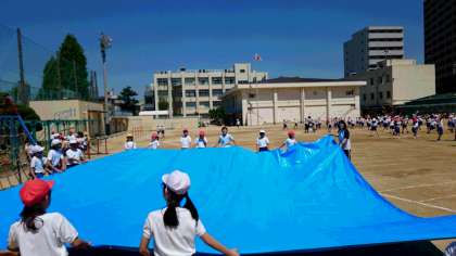 続いて、そこに敷くブルーシートをみんなで協力して3つ折りにしました。