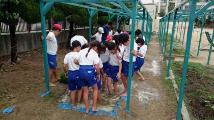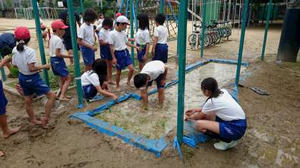5年生が田植えを行いました。石を投げ込まれていたので、まずは、それをみんなで取りました。その後、順番に植えていきました。