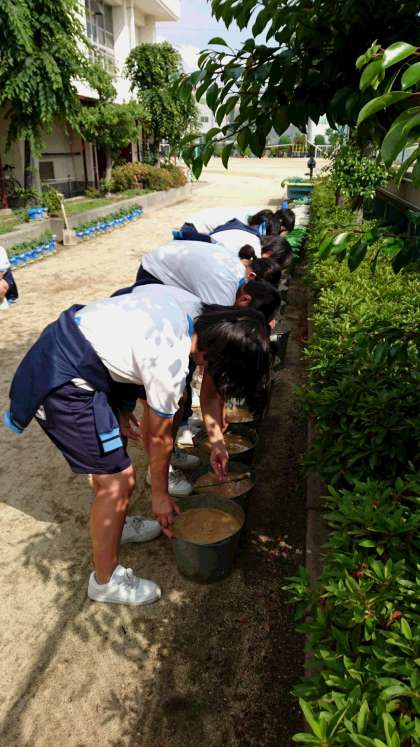職場体験の中学生が、余った苗でバケツ稲の準備をしてくれました。