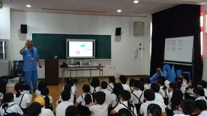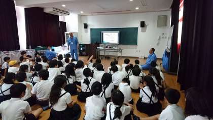 今日は、環境事業センターの方々に来ていただき、「ごみの収集」や「ごみの分別」などについて学習しています。