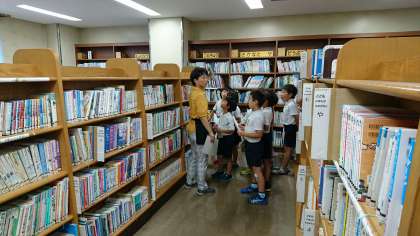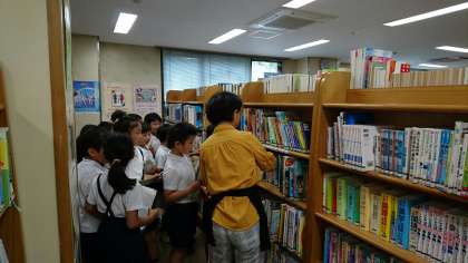 どの棚にどんな本が置いてあるのか、説明していただきました。