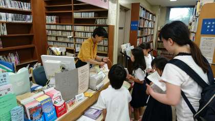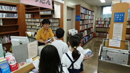借りる本が決まりました。名前を書いて、カウンターに並んで「お願いします。」