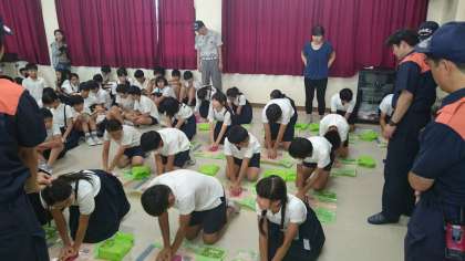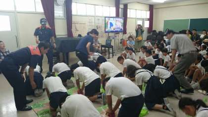 6年生は、消防署の方に来ていただき、胸骨圧迫の方法とAEDの使い方について学びました。
