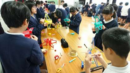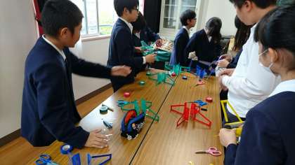 今日は、地域の方に来ていただき、6年生が2〜3時間目にペットボトルロケットの制作をしています。