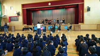 2時間目は、大正東中学校の吹奏楽部のみなさんに来ていただき、演奏を聴かせていただきました。