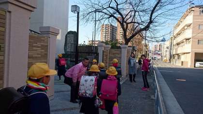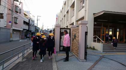 登校時、吉田区長、はじめ区役所の方々が「あいさつ運動」に来て下さいました。