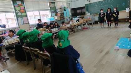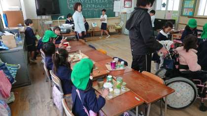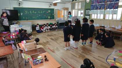 三軒家西幼稚園と1年生が交流をしました。手作りのおもちゃで遊びました。