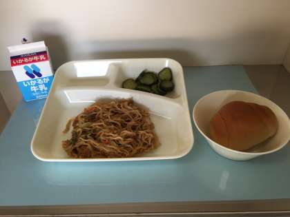 今日の給食は、黒糖パン、牛乳、焼きそば、きゅうりのしょうがづけです。