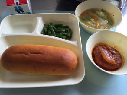今日の給食は、パンプキンパン、牛乳、煮込みハンバーグ、コーンスープ、三度豆のサラダです。