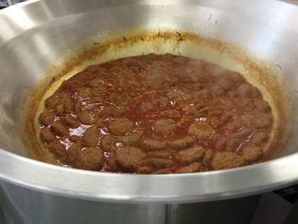 「煮こみハンバーグ」は、 いためたたまねぎと、ケチャップとウスターソースで味付けしたソースでじっくりと煮込みます。