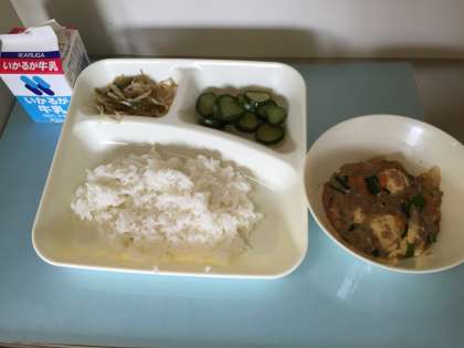 今日の給食は、ごはん、牛乳、マーボーどうふ、きゅうりの甘酢づけ、もやしとピーマンのごまいためです。
