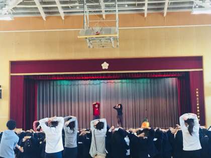 今日から始まるPEタイムで、集まるときの音楽「パオパオダンス」に合わせてストレッチをする練習もしました。